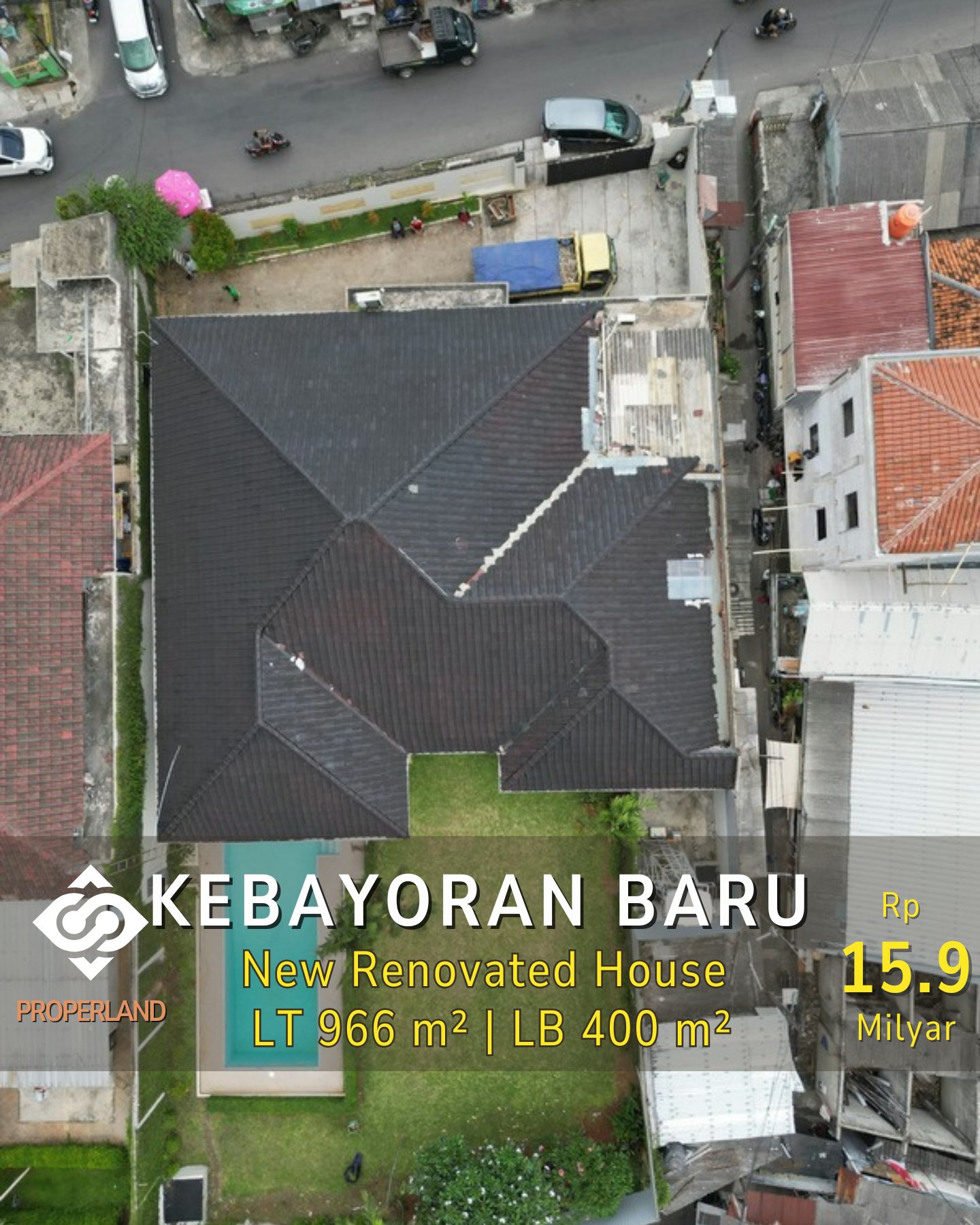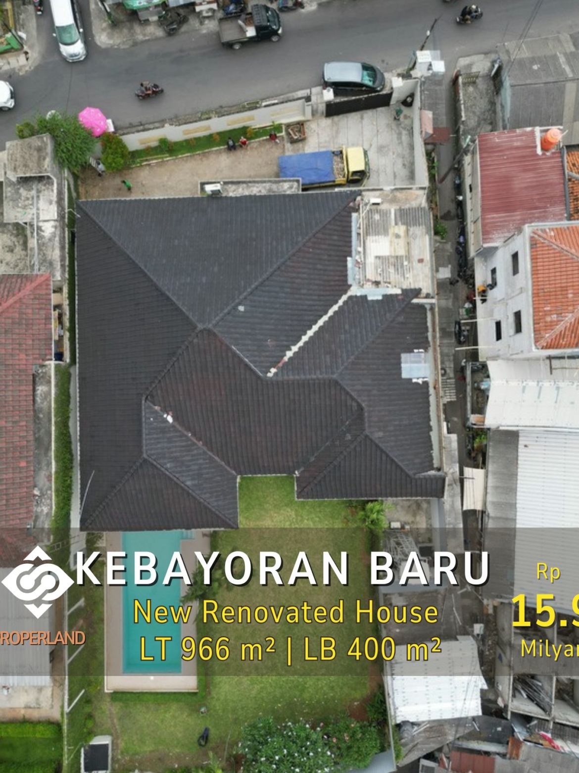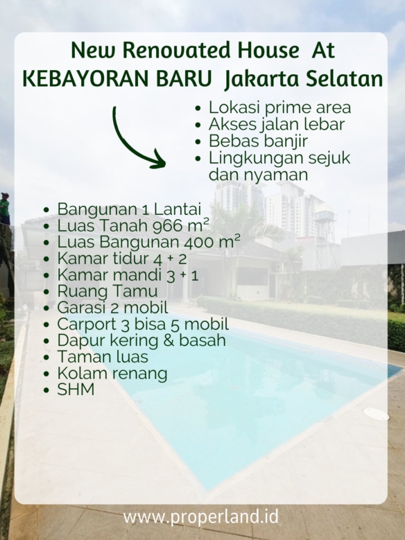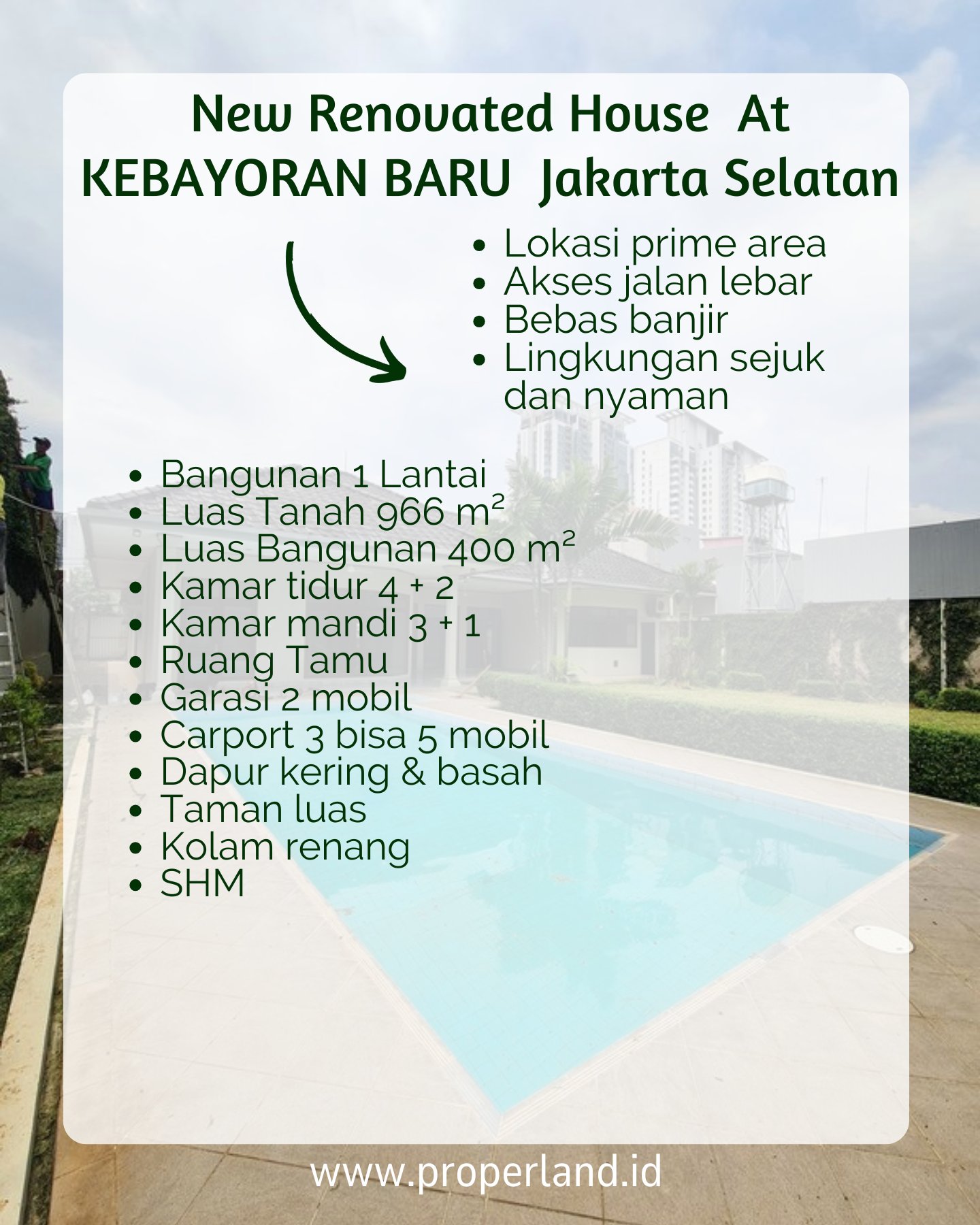 Rumah mewah di Cipete, Kebayoran Baru, Jakarta Selatan, siap huni dan cocok untuk investasi. Lokasi strategis, dekat dengan Darmawangsa Apart, Fatmawati Raya, dan fasilitas publik seperti MRT. Akses mudah dan bebas banjir.Spesifikasi BangunanBangunan 1 lantai, luas tanah 966 m², luas bangunan 400 m², kamar tidur 4 + 2, kamar mandi 3 + 1, ruang tamu, garasi 2 mobil, carport 3 bisa 5 mobil, dapur kering & basah, taman luas, kolam renang, dan SHM.Lokasi StrategisLokasi rumah