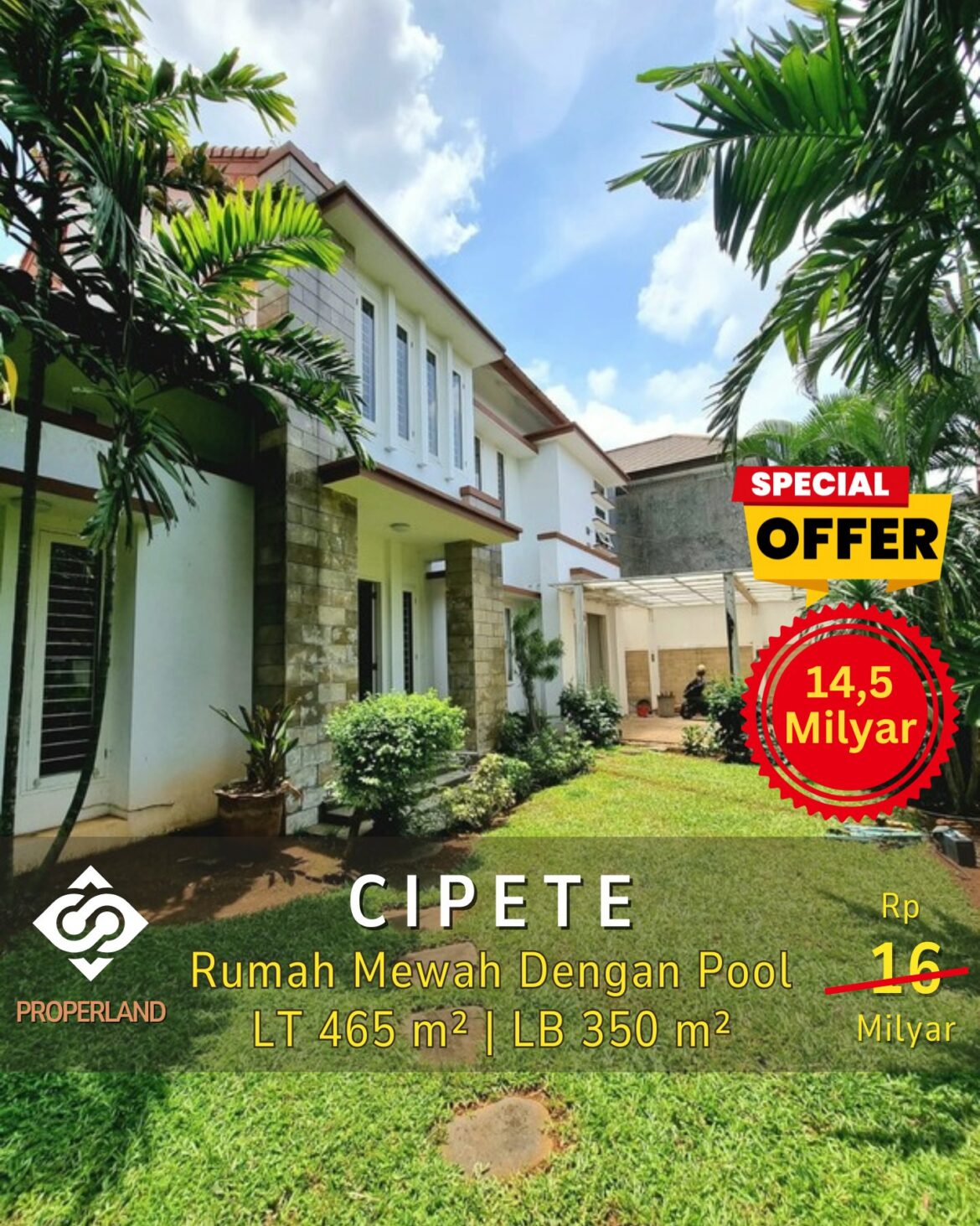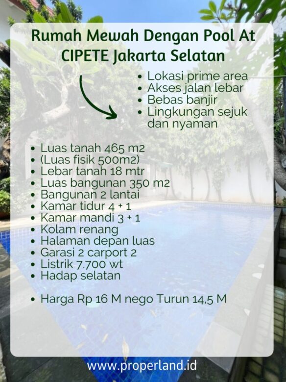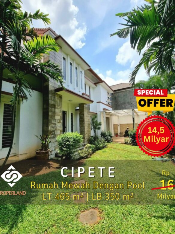 Rumah mewah di Cipete, Jakarta Selatan, dengan kolam renang dan lahan luas, menawarkan kesempatan untuk memiliki tempat tinggal yang nyaman dan mewah. Lokasi strategis, area bagus dan nyaman, jalan lebar, bebas banjir, dan dekat dengan sekolah prancis, membuat rumah ini sangat ideal untuk keluarga. Dengan luas tanah 465 m2 dan luas bangunan 350 m2, rumah ini memiliki 4 kamar tidur + 1, 3 kamar mandi + 1, kolam renang, halaman depan luas, dan garasi 2 carport 2.