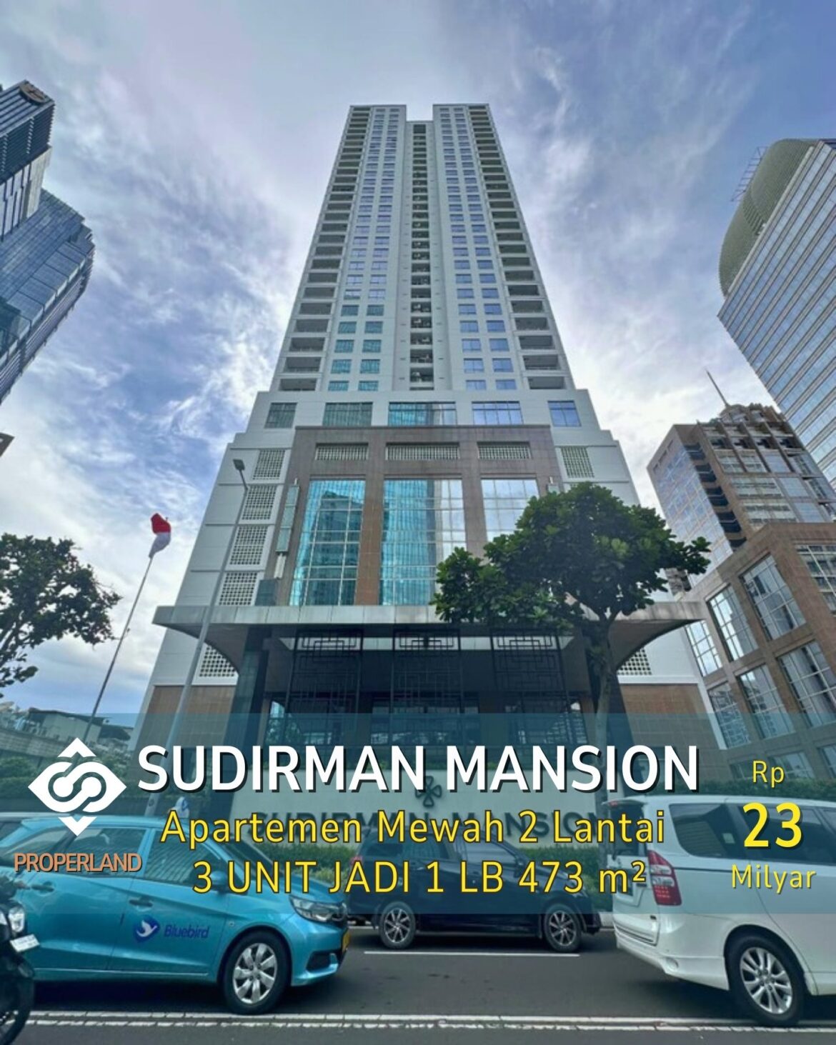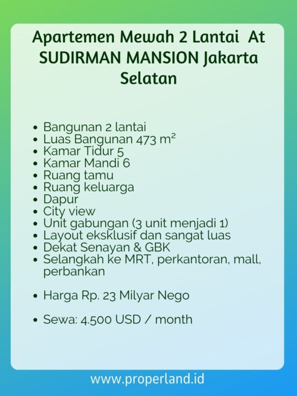 Apartemen mewah 2 lantai di Sudirman Mansion Scbd Jakarta Selatan ini menawarkan lokasi strategis dan nyaman, bebas banjir, serta akses mudah ke berbagai fasilitas seperti MRT, perkantoran, mall, dan perbankan. Dengan luas bangunan 473 m², apartemen ini memiliki 5 kamar tidur, 6 kamar mandi, ruang tamu, ruang keluarga, dan dapur. Unit gabungan ini terdiri dari 3 unit yang digabung menjadi 1, menawarkan layout eksklusif dan sangat luas. Apartemen ini juga menawarkan city view yang indah dan dekat dengan Senayan dan GBK.