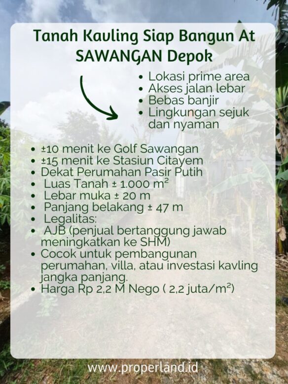 Tanah ini terletak di Bedahan Sawangan Depok, yang merupakan salah satu kawasan yang paling cepat berkembang di Depok. Akses mudah ke Golf Sawangan, Stasiun Citayem, dan Perumahan Pasir Putih membuat tanah ini sangat menarik bagi mereka yang ingin memiliki properti di kawasan yang strategis.