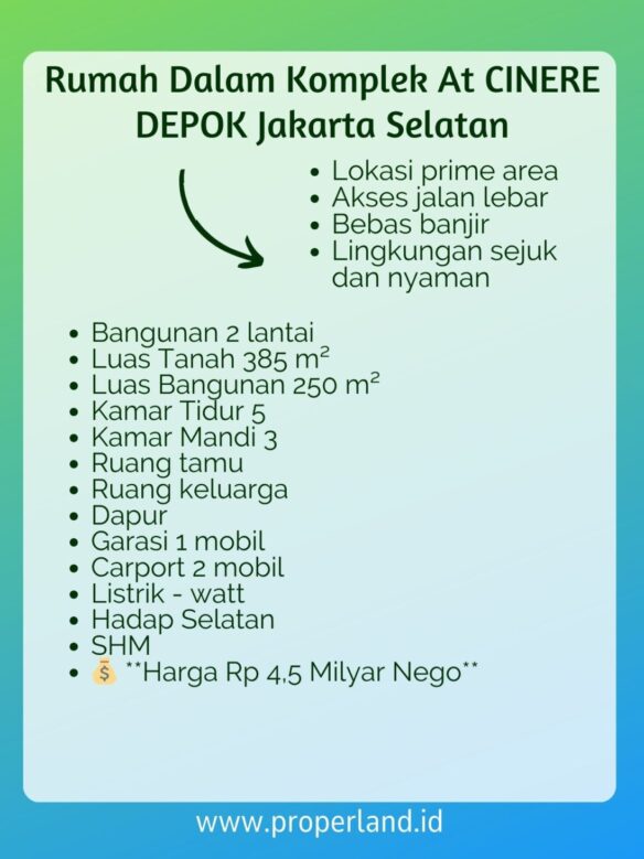 Rumah mewah di Cinere Depok ini adalah pilihan yang tepat bagi Anda yang mencari hunian yang nyaman dan strategis. Lokasinya yang berada di dalam komplek yang tenang dan aman membuat rumah ini sangat cocok untuk keluarga. Dengan akses mudah ke berbagai fasilitas umum seperti Kampus UPN, Pangkalan Jati Golf Club, One Bellpark Mall, dan Cilandak Town Square, rumah ini sangat ideal untuk mereka yang ingin memiliki gaya hidup yang modern dan dinamis.Lokasi StrategisRumah ini terletak