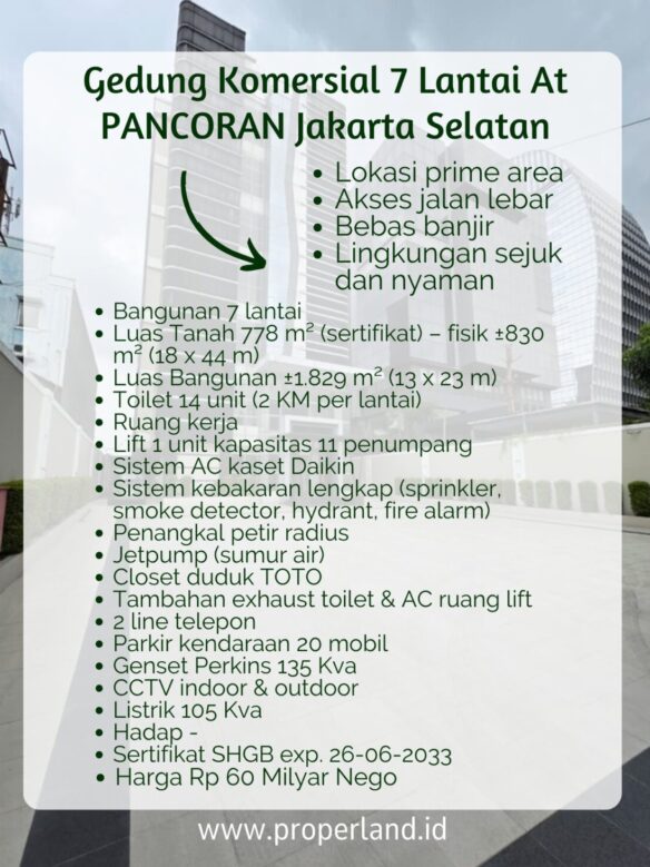 Gedung komersial 7 lantai di Pancoran Jakarta Selatan ini merupakan sebuah peluang investasi yang sangat menarik. Dengan lokasi strategis di area bisnis dan komersial, akses mudah, dan jalan utama, gedung ini sangat ideal untuk berbagai kegiatan usaha.Kelebihan GedungGedung ini memiliki beberapa kelebihan yang membuatnya sangat menarik. Pertama, lokasinya yang strategis membuatnya mudah diakses oleh pelanggan dan karyawan. Kedua, gedung ini memiliki 7 lantai yang dapat digunakan untuk berbagai kegiatan usaha, seperti kantor, toko, atau restoran.FasilitasGedung