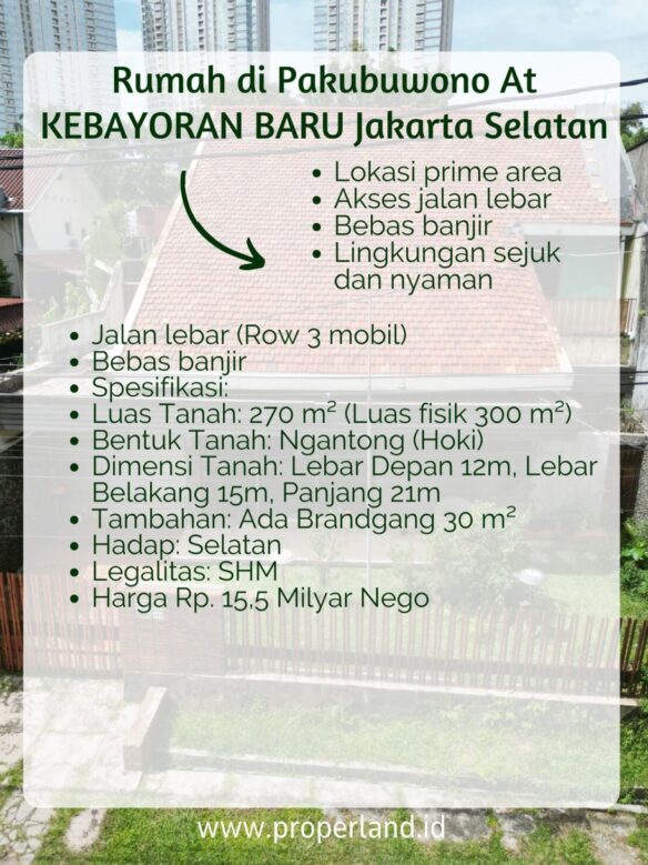 Rumah mewah di Kebayoran Baru, Jakarta Selatan, dengan lokasi strategis dan lingkungan asri, siap untuk dihuni atau dijadikan investasi yang menguntungkan. Dengan luas tanah 270 m² dan bentuk tanah ngantong, rumah ini memiliki potensi besar untuk dijadikan rumah impian Anda.