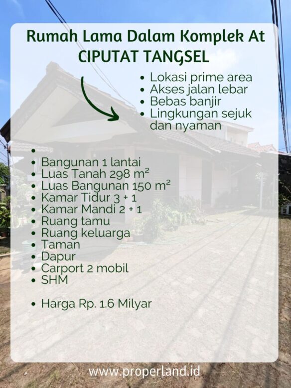 Rumah lama yang strategis dan nyaman di komplek Bukit Nusa Indah, Ciputat, Tangerang Selatan. Lingkungan yang tenang dan asri membuat rumah ini sangat ideal untuk keluarga yang mencari tempat tinggal yang aman dan nyaman.Lokasi StrategisRumah ini terletak di Jl Meranti No.1060, Serua, Ciputat, Tangerang Selatan, yang merupakan lokasi yang sangat strategis dan mudah dijangkau. Jalan lebar dan akses yang mudah membuat rumah ini sangat ideal untuk keluarga yang memiliki mobil.Spesifikasi BangunanRumah ini memiliki bangunan 1