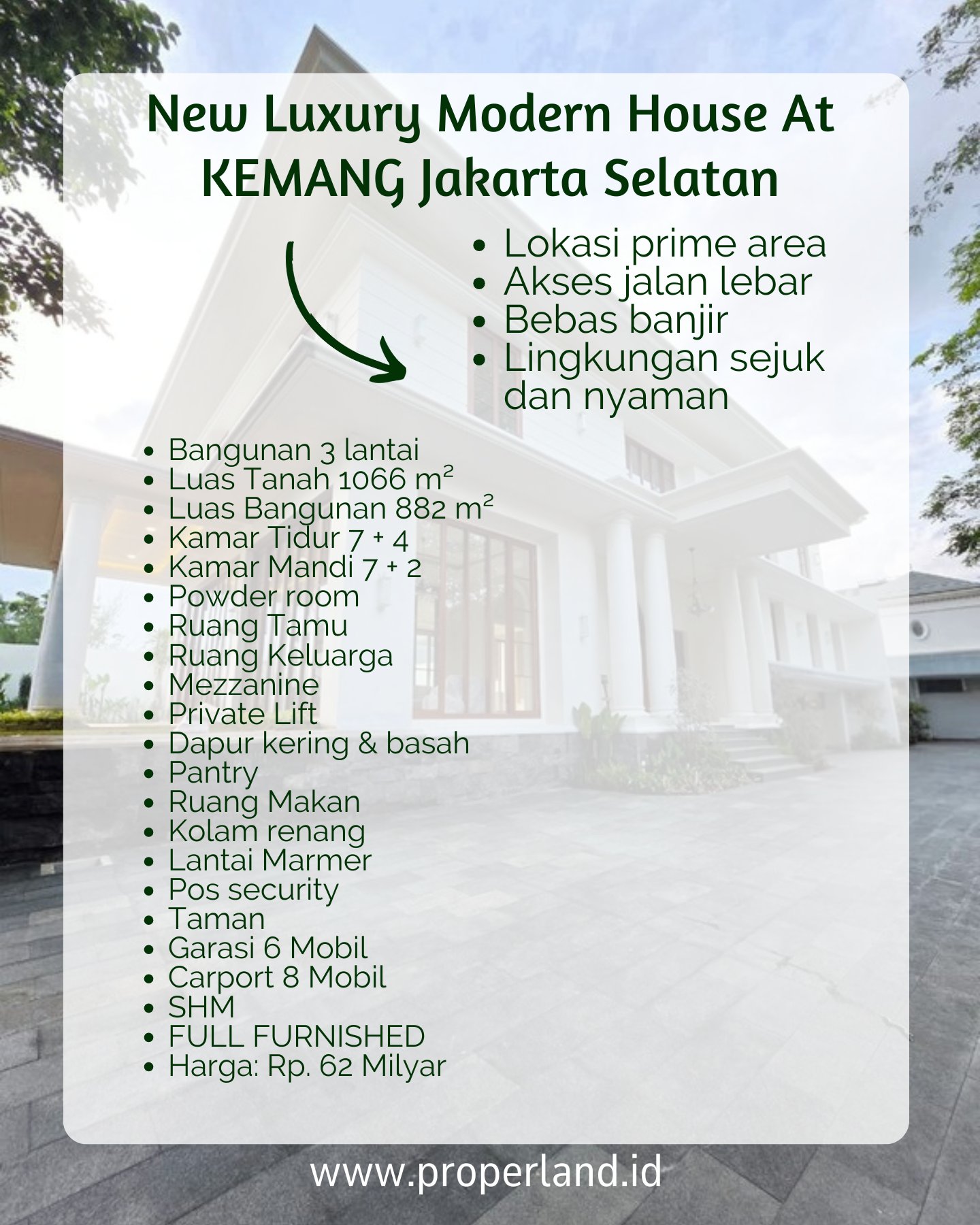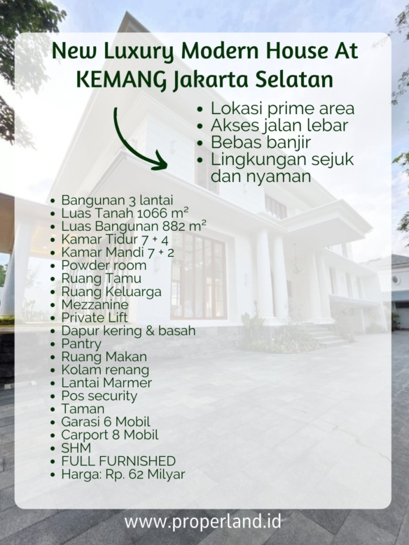 Rumah mewah yang terletak di Kemang, Jakarta Selatan, ini menawarkan kesempurnaan dalam hal desain, kenyamanan, dan lokasi strategis. Dengan luas tanah 1066 m² dan luas bangunan 882 m², rumah ini memiliki 7 kamar tidur dan 7 kamar mandi, serta 4 kamar tidur tambahan dan 2 kamar mandi tambahan. Selain itu, rumah ini juga dilengkapi dengan powder room, ruang tamu, ruang keluarga, mezzanine, private lift, dapur kering dan basah, pantry, ruang makan, kolam renang, dan lantai marmer.