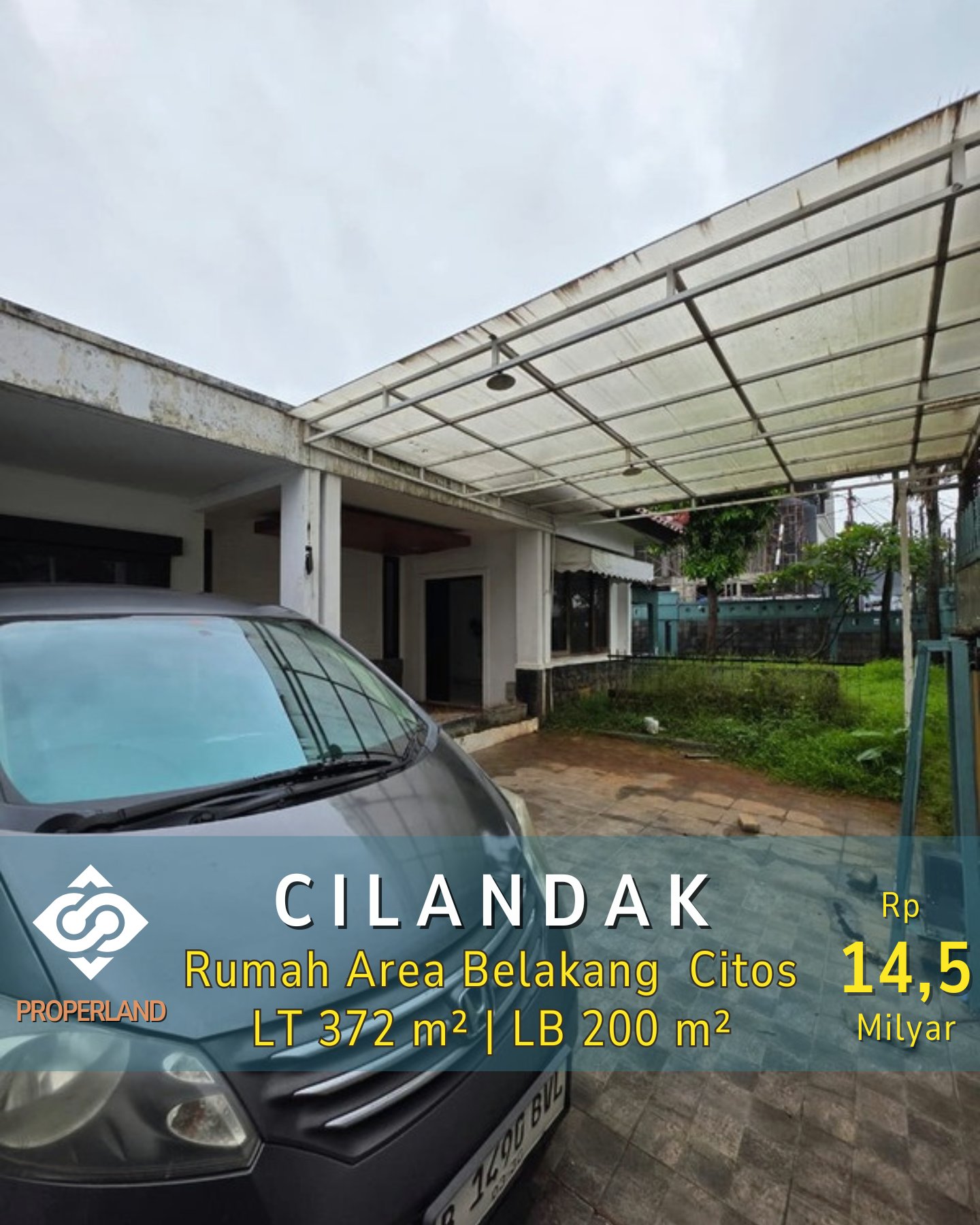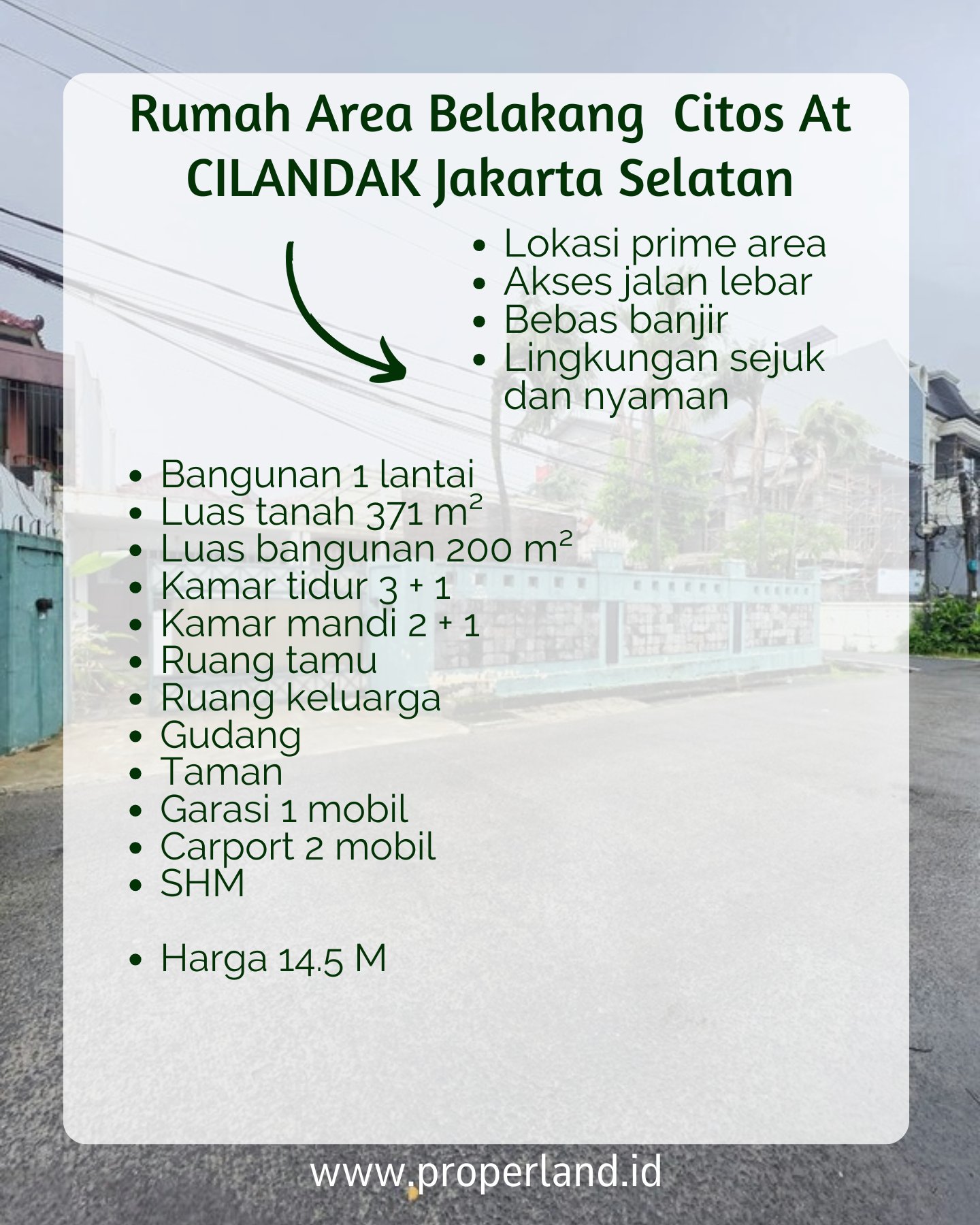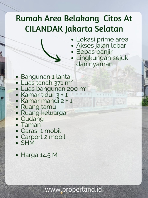 Rumah dijual di area Cilandak, Jakarta Selatan, dengan lokasi strategis di belakang Citos, dekat Cipete dan Antasari, serta akses mudah ke Toll TB Simatupang dan Desari. Jalan yang lebar dan bebas banjir membuat rumah ini sangat nyaman untuk dihuni. Bangunan satu lantai dengan luas tanah 371 m² dan luas bangunan 200 m², dilengkapi dengan 3 kamar tidur + 1, 2 kamar mandi + 1, ruang tamu, ruang keluarga, gudang, taman, garasi 1 mobil, dan carport 2 mobil.