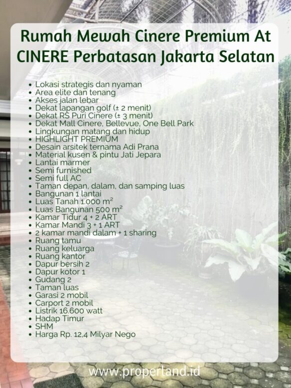 Rumah mewah di Cinere ini menawarkan lokasi strategis dan nyaman, dengan akses jalan lebar dan dekat dengan lapangan golf serta RS Puri Cinere. Area elite dan tenang membuat rumah ini sangat cocok untuk Anda yang mencari tempat tinggal yang aman dan nyaman.