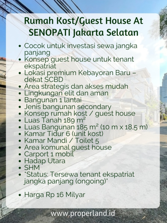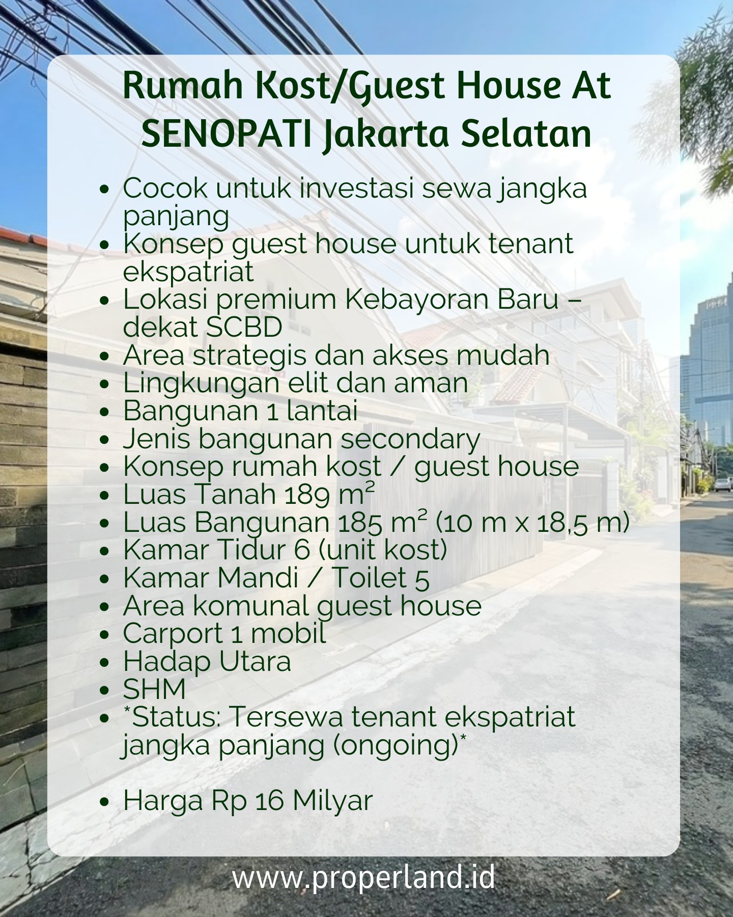 Rumah kost atau guest house yang sangat strategis dan elit di Senopati, Jakarta Selatan, cocok untuk investasi sewa jangka panjang. Konsep guest house ini dirancang khusus untuk tenant ekspatriat, menawarkan lingkungan yang aman dan nyaman. Lokasinya yang premium di Kebayoran Baru, dekat SCBD, membuat akses mudah ke berbagai destinasi di Jakarta.