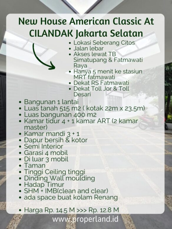 Rumah mewah di Cilandak, Jakarta Selatan, dengan desain American Classic yang elegan dan mewah, siap untuk dihuni oleh Anda dan keluarga. Lokasinya yang strategis, dekat dengan stasiun MRT Fatmawati, RS Fatmawati, dan akses mudah ke jalan tol, membuat rumah ini sangat menarik untuk dijadikan sebagai investasi properti yang menguntungkan.